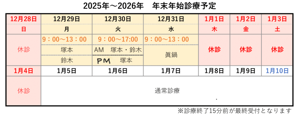 ・1月1日(木)~1月4日(日)までは年始の為休診となります。1月5日(月)より通常診療予定です